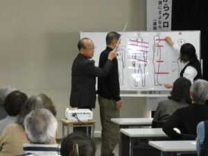 はじめに、講師 松本義雄 氏 (姿勢科学士)が「姿勢科学を物理学と解剖学の分野から学んでみましょう。」と言われ、大学の授業のような空気感でしたが、正しい姿勢のクイズや頭の重みを体感できる人形の登場で一転、和やかな雰囲気になりました。生理的弯曲の重要性や姿勢改善の手順等のお話しがあり、筋肉のストレッチと強化で姿勢が改善することを皆で体感しました。